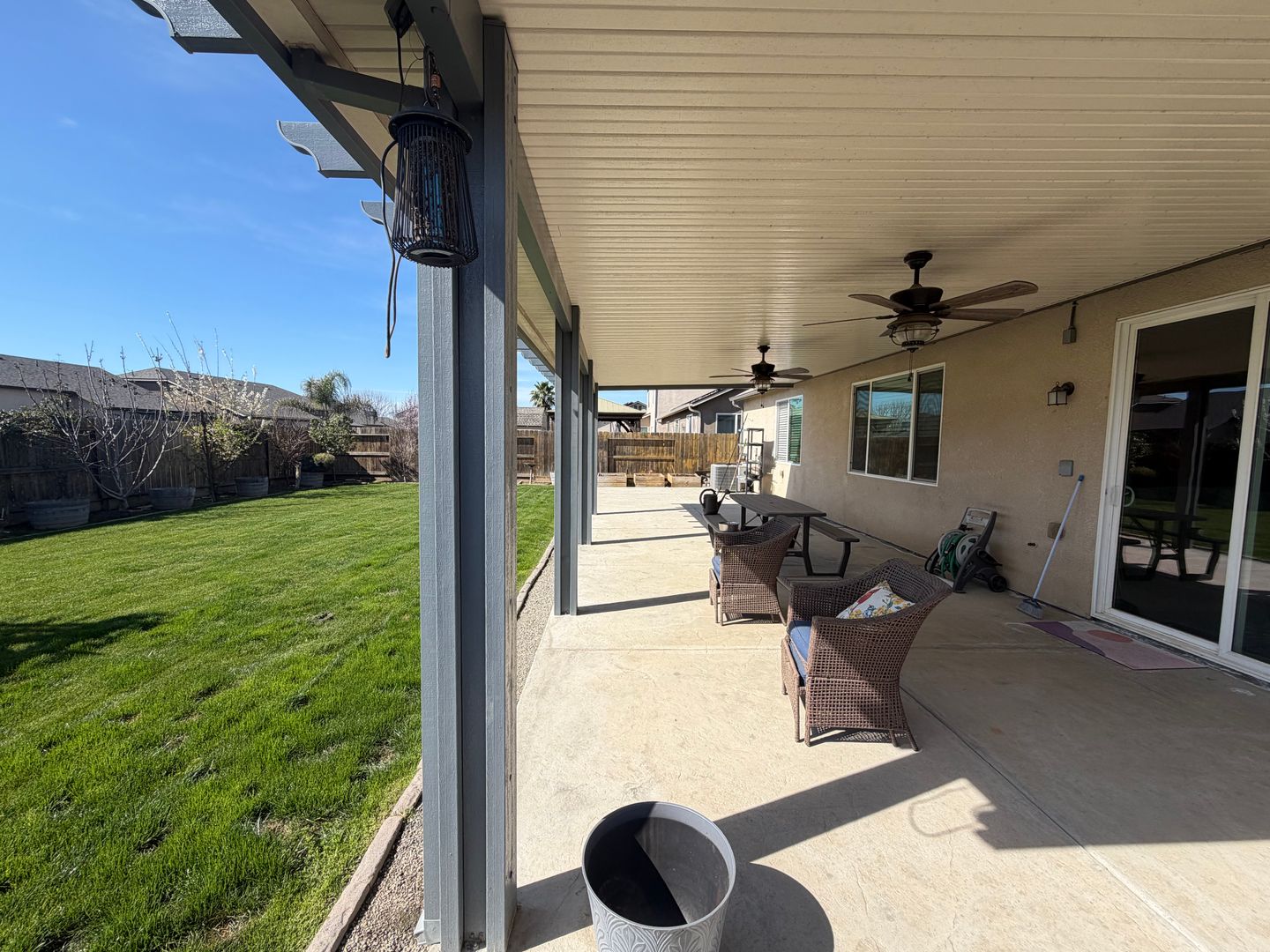 Step outside to a backyard designed for relaxation and entertaining! Enjoy the large covered patio complete with ceiling fans, a generous grass area, and a lovely pergola—perfect for gatherings with family and friends.